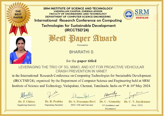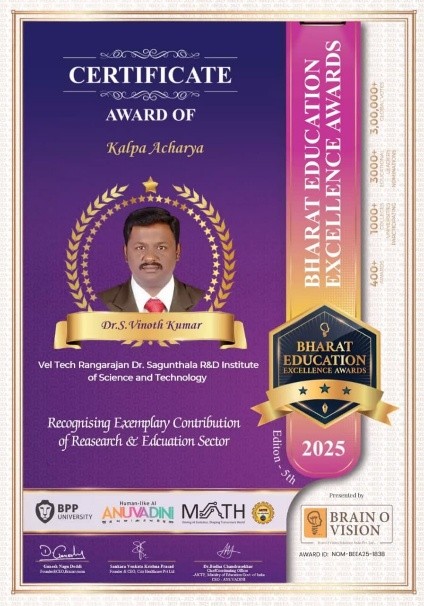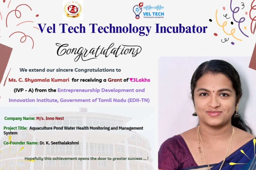 The grant was awarded for her startup M/s. Inno Nest, supported by the Vel Tech Technology Incubator. Her project, “Aquaculture Pond Water Health Monitoring and Management System” focuses on developing a smart solution to monitor and manage water quality in aquaculture ponds to improve productivity. The project is being carried out with the guidance of Dr. K. Seethalakshmi, Co-Founder.