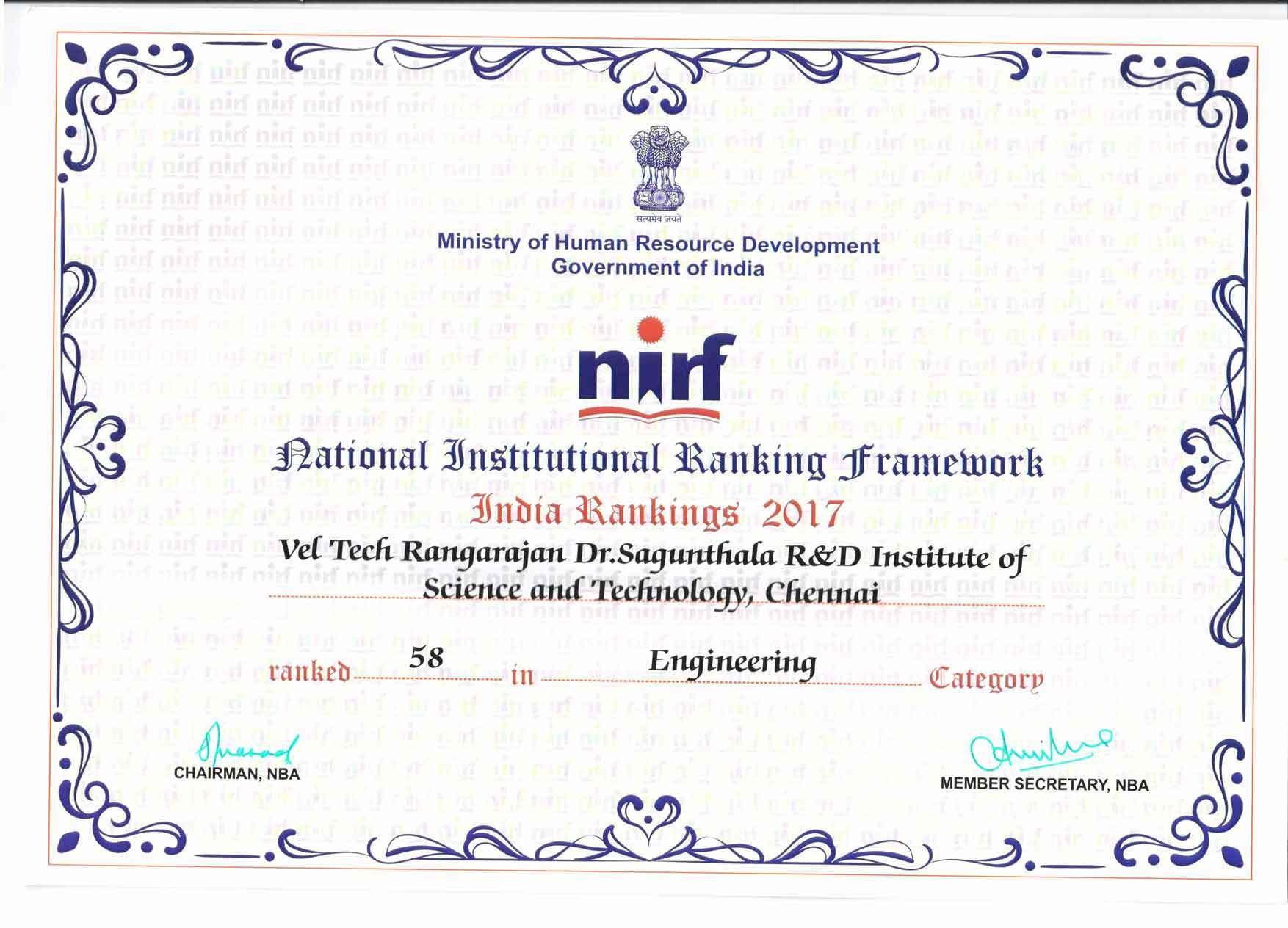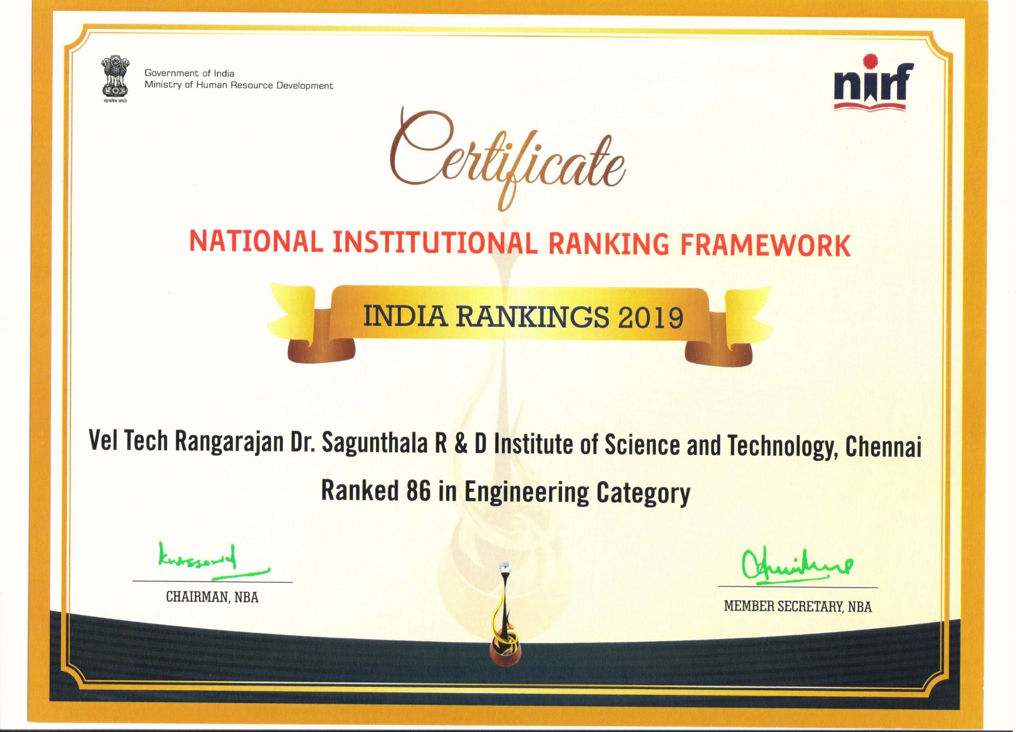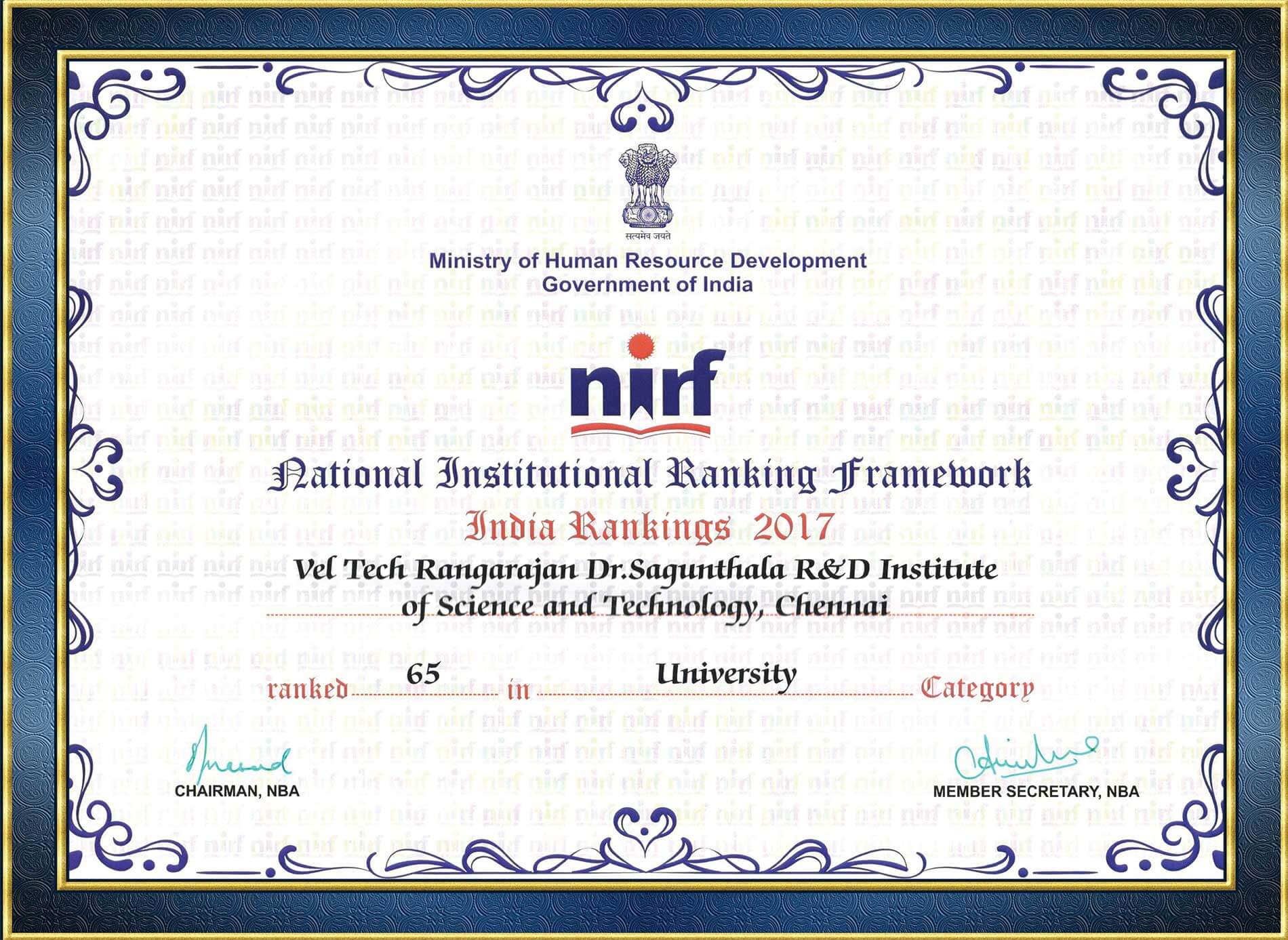The National Institutional Ranking Framework (NIRF) was approved by the MHRD and launched by Honourable Minister of Human Resource Development on 29th September 2015. This framework outlines a methodology to rank institutions across the country. The methodology draws from the overall recommendations broad understanding arrived at by a Core Committee set up by MHRD, to identify the broad parameters for ranking various universities and institutions. The parameters broadly cover “Teaching, Learning and Resources,” “Research and Professional Practices,” “Graduation Outcomes,” “Outreach and Inclusivity,” and “Perception”.