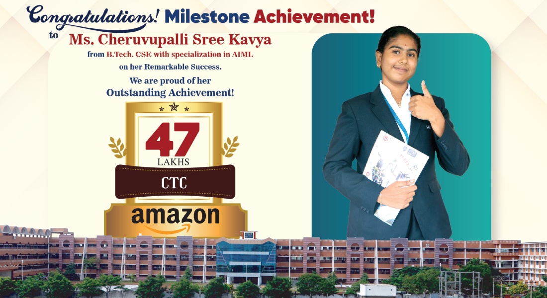 Congratulations! Milestone Achievement! to Ms. Cheruvupalli Sree Kavya from B.Tech. CSE with specialization in AIMLon her Remarkable Success.We are proud of her Outstanding Achievement! 47LAKHS CTC amazon
